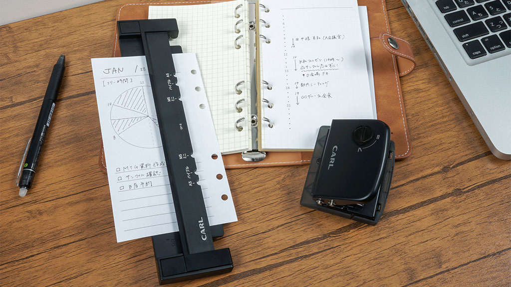 ■カール事務器社の「リフィルメーカー」はパンチ部の凸をゲージ部の凹に合わせてパンチするだけの簡単な操作で、短時間に手帳用のリフィルを簡単に作成できます。■資料、メモ、雑誌の切り抜き等にリフィルメーカーで穴をあけて、手帳に […]