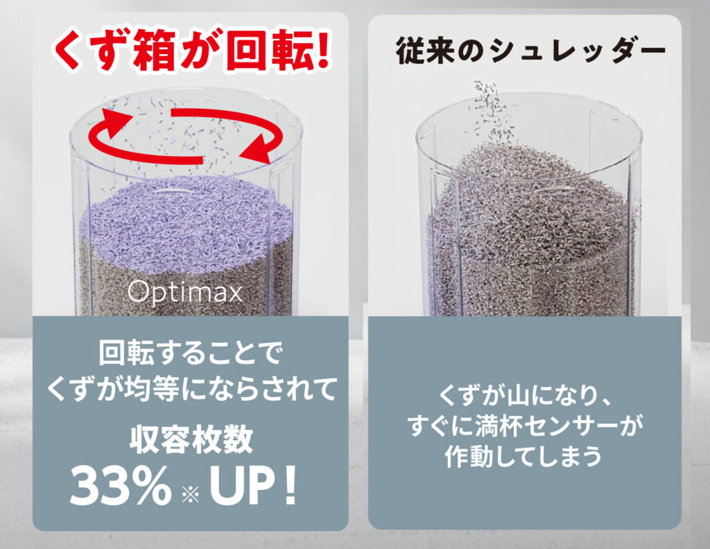 ■円筒形のクズ箱が秘密! 裁断クズが偏って山にならず、収容量が33%アップするNEWスタイルシュレッダー!