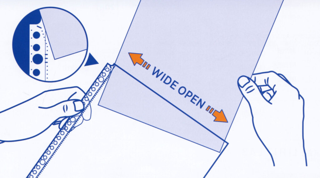 ■新製品「広い間口で出し入れしやすいクリヤーポケット」は、綴じ穴側のポケットの開口部分が広くなる加工をしているので、書類を入れる時の入れにくさを解消します。