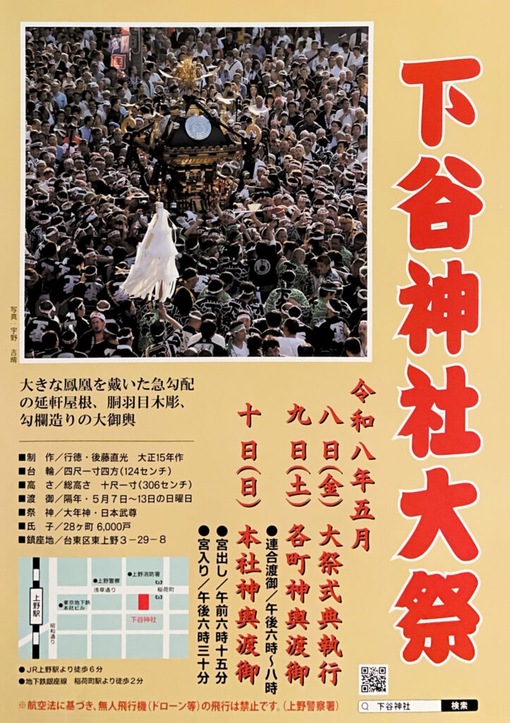 ■下町で1番早い夏祭りとされている「下谷神社大祭」は、1,000年以上の歴史を持ち、本社神輿の渡御を行う「本祭り」と町会神輿の渡御だけの「陰祭り」が隔年に行われています。